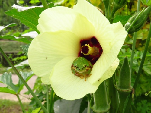 畑 オクラの花にアマガエル ジャガイモを植える 写真なし 14 09 02 大分金太郎の花鳥蝶月 楽天ブログ
